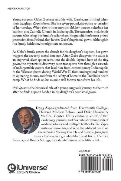 Young surgeon Gabe Goerner and his wife, Cassie, are thrilled when their daughter, Zoey, is born. She is a seven-pound, six-ounce re-creation of her mother. When she is three months old, her parents schedule her baptism at a Catholic Church in Indianapolis. The attendees include his parents who bring the family's cedar chest, his grandfather's most prized possession from Poland, that houses Gabe's baptismal gown. Although it is a family heirloom, its origins are unknown. As Gabe's family enters the church for his daughter's baptism, her gown triggers the security metal detector. After Gabe discovers the cause is an engraved silver spoon sewn into the double-layered hem of the tiny gown, the mysterious discovery soon transports him through a cascade of unforgettable events that lead him from contemporary Indianapolis to the Warsaw ghetto during World War II, from underground bunkers to operating rooms, and from the safety of home to the Treblinka death camp. What he finds on his mission will forever transform his life. Ari's Spoon is the historical tale of a young surgeon's journey to the truth after he finds a spoon hidden in his daughter's baptismal gown.