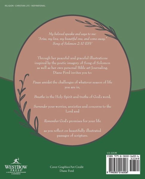 My beloved speaks and says to me: "Arise, my love, my beautiful one, and come away." Song of Solomon 2:10 ESV Through her peaceful and graceful illustrations inspired by the poetic imagery of Song of Solomon as well as her own personal Bible art Journaling, Diane Ford invites you to: Pause amidst the challenges of whatever season of life you are in, Breathe in the Holy Spirit and truths of God's word, Surrender your worries, anxieties and concerns to the Lord and Remember God's promises for your life as you reflect on beautifully illustrated passages of scripture.