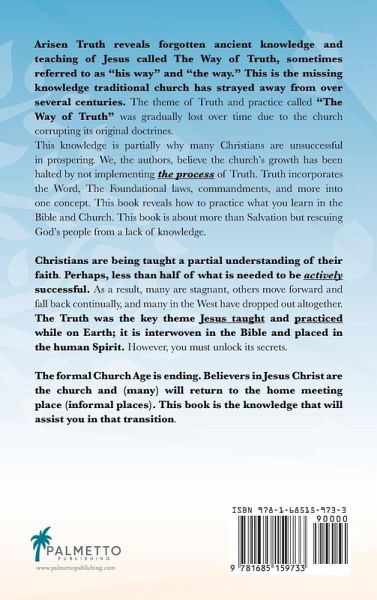 Arisen Truth reveals forgotten ancient knowledge and teaching of Jesus called The Way of Truth, sometimes referred to as "his way" and "the way." This is the missing knowledge traditional church has strayed away from over several centuries. The theme of Truth and practice called "The Way of Truth" was gradually lost over time due to the church corrupting its original doctrines. This knowledge is partially why many Christians are unsuccessful in prospering. We, the authors, believe the church's growth has been halted by not implementing the process of Truth. Truth incorporates the Word, The Foundational laws, commandments, and more into one concept. This book reveals how to practice what you learn in the Bible and Church. This book is about more than Salvation but rescuing God's people from a lack of knowledge. Christians are being taught a partial understanding of their faith. Perhaps, less than half of what is needed to be actively successful. As a result, many are stagnant, others move forward and fall back continually, and many in the West have dropped out altogether. The Truth was the key theme Jesus taught and practiced while on Earth; it is interwoven in the Bible and placed in the human Spirit. However, you must unlock its secrets. The formal Church Age is ending. Believers in Jesus Christ are the church and (many) will return to the home meeting place (informal places). This book is the knowledge that will assist you in that transition.