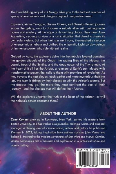 The breathtaking sequel to Eternigy takes you to the farthest reaches of space, where secrets and dangers beyond imagination await. Explorers Jaimin Caraggio, Shanna Oneen, and Quantus Kelmin journey across the galaxy, only to discover a nebula alive with unimaginable power and mystery. At the edge of its swirling clouds, they meet Auro Augustine, a young survivor of a lost civilization that dared to create its own solar system. But when their star went nova, it unleashed a cascade of energy into a nebula and birthed the enigmatic Light Lords-beings of immense power who rule vibrant realms. Guided by Auro, the explorers delve into the nebula's layered domains: the golden citadels of the Gnost, the raging fires of the Magna, the cosmic trees of the Syntha, and the deep ocean of the Thyrrenean. At the heart of it all lies the Aristar, a remnant of Earth's sun infused with transformative power, that calls to them with promises of revelation. As they traverse the vast clouds, each darker and more mysterious than the last, the team is driven by their obsession with the Aristar's secrets. But the deeper they go, the more they must confront the cost of their journey-and the choices that will define their futures. Will the explorers uncover the truth at the heart of the Aristar-or will the nebula's power consume them?
