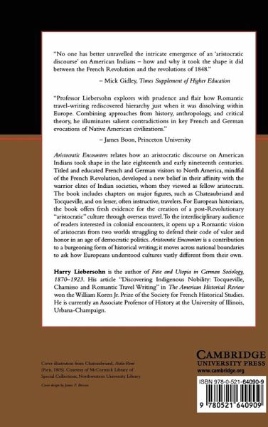 Aristocratic Encounters, first published in 1999, relates how an aristocratic discourse on American Indians took shape in the late eighteenth and early nineteenth centuries. Titled and educated French and German visitors to North America, mindful of the French Revolution, developed a new belief in their affinity with the warrior elites of Indian societies, whom they viewed as fellow aristocrats. The book includes chapters on major figures, such as Chateaubriand and de Tocqueville, and on lesser, often instructive, travelers. For European historians, the book offers fresh evidence for the creation of a post-Revolutionary 'aristocratic' culture through overseas travel. To the interdisciplinary audience of readers interested in colonial encounters, it opens up a Romantic vision of aristocrats from two worlds struggling to defend their code of valor and honor in an age of democratic politics. Aristocratic Encounters is a contribution to a burgeoning form of historical writing; it moves across national boundaries to ask how Europeans understood cultures vastly different from their own.