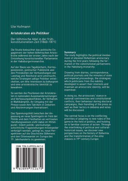 Die Studie beleuchtet das politische Engagement der hohen böhmischen Aristokratie während der ersten Jahre nach der Entstehung konstitutioneller Parlamente in der Habsburgermonarchie. Auf der Basis von Tagebüchern, Korrespondenzen, politischer Publizistik und den Protokollen der Verhandlungen von Landtag und Reichsrat wird untersucht, welche Strategien adlige Politiker entwickelten, um ihre Interessen zu behaupten und eine aristokratische Identität zu bewahren.