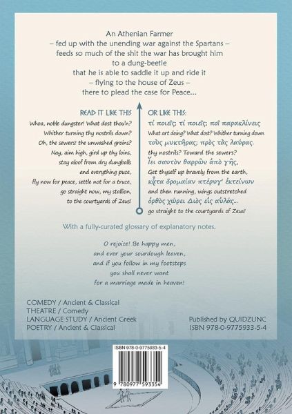 An Athenian Farmer - fed up with the unending war against the Spartans - feeds so much of the shit the war has brought him to a dung-beetle that he is able to saddle it up and ride it - flying to the house of Zeus - there to plead the case for Peace... Before now, only initiates into the mysteries of Ancient Greek could truly appreciate the genius of Aristophanes, but with this book, all those wishing to read, sing, play, or study this groundbreaking masterpiece have all that they need in hand: a lively and modern text offering two complimentary versions of the play - one in fleetfooted verse, where everything hitherto obscure has been stood to reason by a few carefully concocted rhymes - and a second, a near-verbatim interlineal, woven into a curated copy of the original Attic Greek... The book includes a fully customized glossary of explanatory notes (with more sober explanations than those of the rhyming verse!) for the many, often mysterious allusions to which each entry refers. QUIDZUNC is also now sponsoring a youtube channel dedicated to publishing selections from Fraser's translations as a suite of songs. You can view the playlist for PEACE at https://www.youtube.com/playlist?list=PL9gKIjAJZVoiTmD3-d6xhZeMRaLTyIbsf