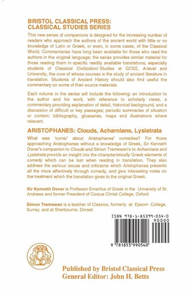 What was 'comic' about Aristophanes' comedies? For those approaching Aristophanes without a knowledge of Greek, this companion to Alan Sommerstein's Penguin translation of Aristophanes' Clouds, Acharnians and Lysistrata is the perfect introduction. Sir Kenneth Dover's companion to Clouds and Simon Tremmewan's to Acharnians and Lysistrata provide an insight into the characteristically Greek elements of comedy which can be lost when reading in translation. They also address the serious issues and criticisms which Aristophanes presents all the more effectively through comedy, and give interesting notes on the treatment which the translation gives to the original Greek.