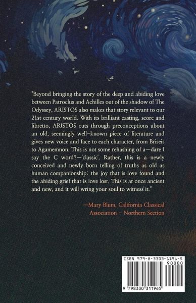 "Beyond bringing the story of the deep and abiding love between Patroclus and Achilles out of the shadow of The Odyssey, ARISTOS also makes that story relevant to our 21st century world. With its brilliant casting, score and libretto, ARISTOS cuts through preconceptions about an old, seemingly well-known piece of literature and gives new voice and face to each character, from Briseis to Agamemnon. This is not some rehashing of a - dare I say the C word? - "classic". Rather, this is a newly conceived and newly born telling of truths as old as human companionship: the joy that is love found and the abiding grief that is love lost. This is at once ancient and new, and it will wring your soul to witness it." - Mary Blum, California Classical Association - Northern Section