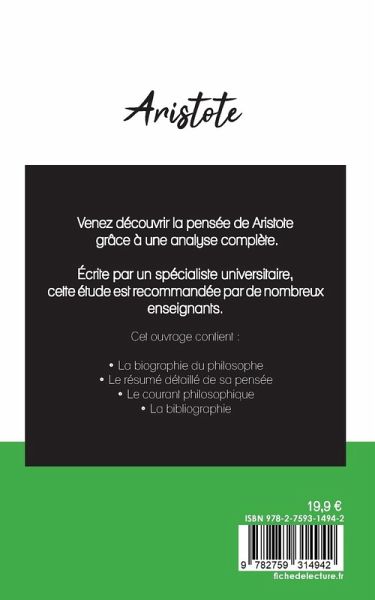 Venez découvrir la pensée d'Aristote grâce à une analyse philosophique de référence ! Écrite par un spécialiste universitaire, cette étude est recommandée par de nombreux enseignants. Cet ouvrage contient notamment la biographie du philosophe, le résumé détaillé de sa pensée, ainsi que l'analyse de son courant philosophique. Retrouvez tous nos titres sur : www.fichedelecture.fr.