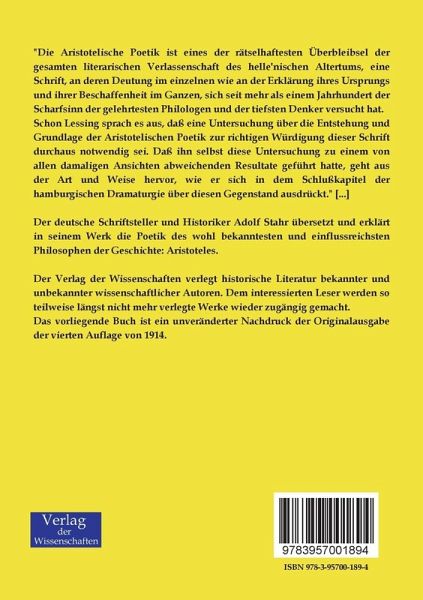 "Die Aristotelische Poetik ist eines der rätselhaftesten Überbleibsel der gesamten literarischen Verlassenschaft des helle'nischen Altertums, eine Schrift, an deren Deutung im einzelnen wie an der Erklärung ihres Ursprungs und ihrer Beschaffenheit im Ganzen, sich seit mehr als einem Jahrhundert der Scharfsinn der gelehrtesten Philologen und der tiefsten Denker versucht hat.