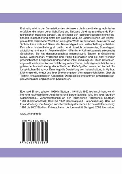 Erstmalig wird in der Dissertation des Verfassers die Instandhaltung technischer Artefakte, die neben deren Schaffung und Nutzung die dritte grundlegende Form technischen Handelns darstellt, als Teilthema der Technikphilosophie intensiv behandelt. Instandhaltung bietet den einzigen Weg, die unermeßlichen und vielfältigen mittels technischer Verfahren erzeugten Werte zu bewahren. Kein Nutzer von Technik kann sich auf Dauer der Notwendigkeit von Instandhaltung entziehen. Deshalb ist Instandhaltung ein zeitlich und räumlich umfassendes, überwiegend alltägliches und nur in Ausnahmefällen öffentliche Aufmerksamkeit erregendes Geschehen. Sie hat dessenungeachtet eindrucksvolle Spuren in Geschichte, Kultur, Wissenschaft, Wirtschaft und Politik hinterlassen und bei nicht wenigen geschichtlichen Ereignissen bedeutenden Einfluß mit ausgeübt. Diese Untersuchung stellt, nach einer kurzen Einführung in das Thema, technikgeschichtliche Zeugnisse der Instandhaltung, der Abläufe und Einflußgrößen sowie den technikphilosophischen Ertrag vor. Dem folgt die Darstellung von Instandhaltung in Mythos, Dichtung und Literatur und ihrer Einordnung nach geistesgeschichtlichen, über die Technik hinausreichenden Kategorien. Die Beispiele entstammen jahrtausendelangen Zeiträumen und mehreren Kontinenten.