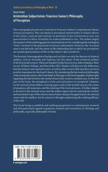 This monograph presents new material on Francisco Suárez's comprehensive theory of sense perception. The core theme is perceptual intentionality in Suárez's theory of the senses, external and internal, as presented in his Commentaria una cum quaestionibus in libros Aristotelis De anima published in 1621. The author targets the question of the multistage genesis of perceptual acts by considering the ontological "items" involved in the procession of sensory information. However, the structural issue is not left aside, and the nature of the relationship due to which our perceptions are mental representations of this or that object is also considered.