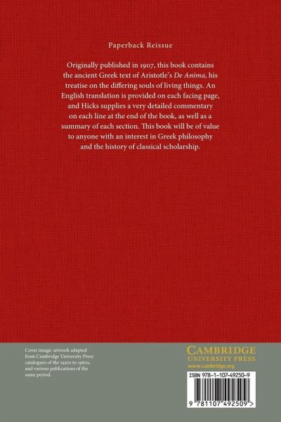 Originally published in 1907, this book contains the ancient Greek text of Aristotle's De Anima, his treatise on the differing souls of living things. An English translation is provided on each facing page, and Hicks supplies a very detailed commentary on each line at the end of the book, as well as a summary of each section. This book will be of value to anyone with an interest in Greek philosophy and the history of classical scholarship.