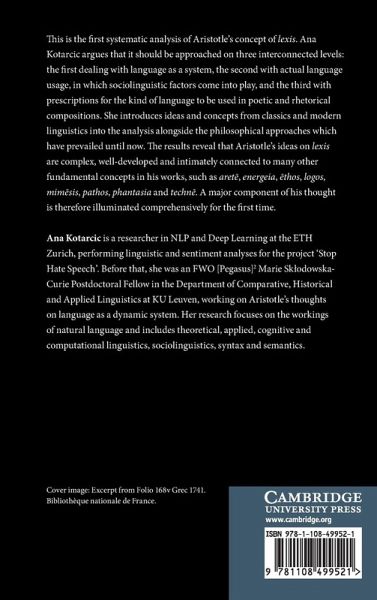 The first systematic analysis of Aristotle's concept of lexis, which is approached on three interconnected levels: the first dealing with language as a system, the second with actual language usage, and the third with prescriptions for the kind of language to be used in poetic and rhetorical compositions.