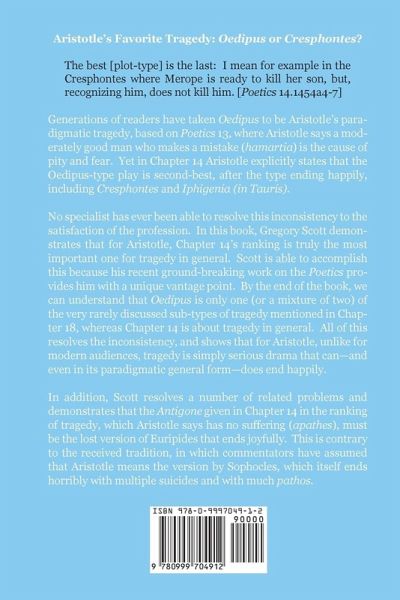The Poetics is considered the foundation of Western dramatic and literary theory, and readers interpret Aristotle on the basis of Chapter 13 to claim that Oedipus, with its pity, fear and horrible ending, is always the finest type of tragedy. Some specialists, however, discuss Aristotle also stating in Chapter 14 that the happily-ending plays like Cresphontes are the finest, with the type of plays like Oedipus, which involve an agent killing or committing great suffering to a family member and only recognizing the family connection afterwards, being second-best. This passage obviously creates a dilemma. No commentator has ever been able to resolve it to the satisfaction of the profession, and as a result Oedipus maintains its stature. Indeed, the specialist Elizabeth Belfiore recently published ("The Elements of Tragedy," in A Companion to Aristotle, ed. Georgios Anagnostopoulos, 2009) a defense of Oedipus as the best play for Aristotle in spite of the explicit ranking of Chapter 14. Gregory Scott here demonstrates instead that Aristotle actually means what he says in Chapter 14: Trag¿idia, originally "goat-song" or the like, and typically translated misleadingly as "tragedy," really involves for him serious drama primarily about good people, and Aristotle says three times in the book that it can end in misfortune or in fortune. Scott, building on his ground-breaking work from 2003, "Purging the Poetics" (Oxford Studies in Ancient Philosophy) that is reprinted in his Aristotle on Dramatic Musical Composition: The Real Role of Literature, Catharsis, Music and Dance in the POETICS (2nd ed., 2018), resolves the dilemma between Chapters 13 and 14 once and for all, showing that the latter half of Chapter 14 is about trag¿idia in general while the earlier text is only about one or two (or a mixture) of the subclasses of trag¿idia as given in Chapter 18 and rarely discussed by commentators: "tragedy" of suffering, complex "tragedy," "tragedy" of character, and simple/spectacular "tragedy." The chapters are arbitrary divisions from the Renaissance and the texts must have both come from different original treatises of Aristotle and been assembled badly after his death, or the texts were part of a much larger work, now lost, in which the rest of the theory and the transitions from one topic to another were delineated. In addition to resolving the perennial dilemma and shining a better light on Aristotle's notion of "tragedy," Scott also explains why the best type of play like Cresphontes is better than the second-best one, when they both have recognition and reversal, the conditions for the best kind of plot for Aristotle. With all of this in place, we can easily detect another dilemma that rarely gets discussed in the ranking of the four types of "tragedy" in Chapter 14: The third best type, which is not problematic in this context, involves an agent who knows someone is a family member and who kills the member anyway; we can easily deduce Medea is an example. However, all known commentators accept that Aristotle speaks of Sophocles' horribly-ending Antigone when he exemplifies the worst of the four types. Yet the reason Aristotle gives for the last-place finish is that Antigone is both apathes, "without suffering," and miaron, "shocking" or "revolting." Scott explains in detail not only that Aristotle must be speaking of Euripides' version of Antigone, which ends happily, but why its last-place ranking results. For Updates and Errata: www.epspress.com/ArFavUpdates.html