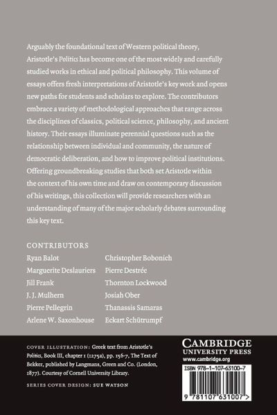 Arguably the foundational text of Western political theory, Aristotle's Politics has become one of the most widely and carefully studied works in ethical and political philosophy. This volume of essays offers fresh interpretations of Aristotle's key work and opens new paths for students and scholars to explore. The contributors embrace a variety of methodological approaches that range across the disciplines of classics, political science, philosophy, and ancient history. Their essays illuminate perennial questions such as the relationship between individual and community, the nature of democratic deliberation, and how to improve political institutions. Offering groundbreaking studies that both set Aristotle within the context of his own time and draw on contemporary discussion of his writings, this collection will provide researchers with an understanding of many of the major scholarly debates surrounding this key text.