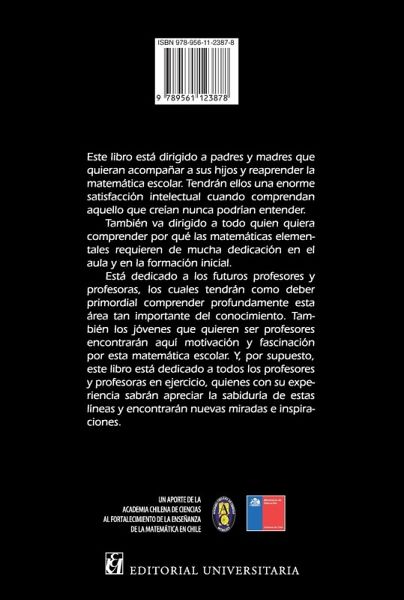 Este libro está dirigido a padres y madres que quieran acompañar a sus hijos y reaprender la matemática escolar. Tendrán ellos una enorme satisfacción intelectual cuando comprendan aquello que creían nunca podrían entender. También va dirigido a todo quien quiera comprender por qué las matemáticas elementales requieren de mucha dedicación en el aula y en la formación inicial. Está dedicado a los futuros profesores y profesoras, los cuales tendrán como deber primordial comprender profundamente esta área tan importante del conocimiento. También los jóvenes que quieren ser profesores encontrarán aquí motivación y fascinación por esta matemática escolar. Y, por supuesto, este libro está dedicado a todos los profesores y profesoras en ejercicio, quienes con su experiencia sabrán apreciar la sabiduría de estas líneas y encontrarán nuevas miradas e inspiraciones.