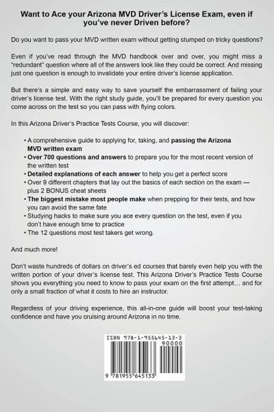 Want to Ace your Arizona MVD Driver's License Exam, even if you've never Driven before? Are you afraid of failing your driver's license test? Or have you failed the test before and still aren't sure what the right answers are? Do you want to pass your MVD written exam without getting stumped on tricky questions? You might've heard that the driver's license test in Arizona is immensely difficult, regardless of your driving experience. Plenty of out-of-staters will tell you horror stories of how they failed terribly on the written exam... despite years of driving under their belts. And it's even scarier if you've never been behind the wheel. Because as excited as you may be to start driving on your own... you only get a few tries to pass the written test... before you're forced to begin the whole application process all over again. Even if you've read through the MVD handbook over and over, you might miss a "redundant" question where all of the answers look like they could be correct. And missing just one question is enough to invalidate your entire driver's license application. But there's a simple and easy way to save yourself the embarrassment of failing your driver's license test. With the right study guide, you'll be prepared for every question you come across on the test so you can pass with flying colors. In this Arizona Driver's Practice Tests Course, you will discover: * A comprehensive guide to applying for, taking, and passing the Arizona MVD written exam * Over 700 questions and answers to prepare you for the most recent version of the written test * Detailed explanations of each answer to help you get a perfect score * Over 9 different chapters that lay out the basics of each section on the exam - plus 2 BONUS cheat sheets * The biggest mistake most people make when prepping for their tests, and how you can avoid the same fate * 56 tips and tricks to get you ready for both the written exam and the road test * Studying hacks to make sure you ace every question on the test, even if you don't have enough time to practice * The 12 questions most test takers get wrong - answer these the right way if you don't want to fail And much more! Don't waste hundreds or even thousands of dollars on driver's ed courses that barely even help you with the written portion of your driver's license test. This Arizona Driver's Practice Tests Course shows you everything you need to know to pass your exam on the first attempt... and for only a small fraction of what it costs to hire an instructor. Regardless of your driving experience, this all-in-one guide will boost your test-taking confidence and have you cruising around Arizona in no time. You could keep sitting at home worrying about whether or not you're going to have to retake the test... or you can master all the essential road rules, skills, and practices and get one step closer to obtaining your driver's license. If you want to Pass your MVD written exam once and for all, then scroll up and click the "Add t