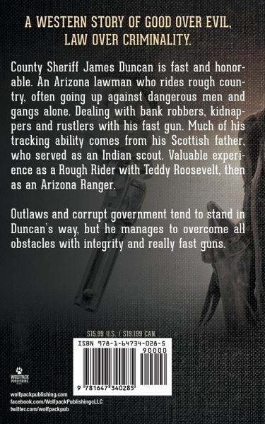 A WESTERN STORY OF GOOD OVER EVIL, LAW OVER CRIMINALITY. County Sheriff James Duncan is fast and honorable. An Arizona lawman who rides rough country, often going up against dangerous men and gangs alone. Dealing with bank robbers, kidnappers and rustlers with his fast gun. Much of his tracking ability comes from his Scottish father, who served as an Indian scout. Valuable experience as a Rough Rider with Teddy Roosevelt, then as an Arizona Ranger. Outlaws and corrupt government tend to stand in Duncan's way, but he manages to overcome all obstacles with integrity and really fast guns.