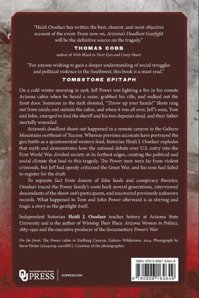 On a cold winter morning, Jeff Power was lighting a fire in his remote Arizona cabin when he heard a noise, grabbed his rifle, and walked out the front door. Someone in the dark shouted, "Throw up your hands!" Shots rang out from inside and outside the cabin, and when it was all over, Jeff's sons, Tom and John, emerged to find the sheriff and his two deputies dead, and their father mortally wounded. Arizona's deadliest shoot-out happened not in 1881, but in 1918 as the United States plunged into World War I, and not in Tombstone, but in a remote canyon in the Galiuro Mountains northeast of Tucson. Whereas previous accounts have portrayed the gun battle as a quintessential western feud, historian Heidi J. Osselaer explodes that myth and demonstrates how the national debate over U.S. entry into the First World War divided society at its farthest edges, creating the political and social climate that lead to this tragedy. A vivid, thoroughly researched account, Arizona's Deadliest Gunfight describes an impoverished family that wanted nothing to do with modern civilization. Jeff Power had built his cabin miles from the nearest settlement, yet he could not escape the federal government's expanding reach. The Power men were far from violent criminals, but Jeff had openly criticized the Great War, and his sons had failed to register for the draft. To separate fact from dozens of false leads and conspiracy theories, Osselaer traced the Power family's roots back several generations, interviewed descendants of the shoot-out's participants, and uncovered previously unknown records. What happened to Tom and John Power afterward is as stirring and tragic a story as the gunfight itself. Weaving together a family-based local history with national themes of wartime social discord, rural poverty, and dissent, Arizona's Deadliest Gunfight will be the authoritative account of the 1918 incident and the memorable events that unfolded in its wake.