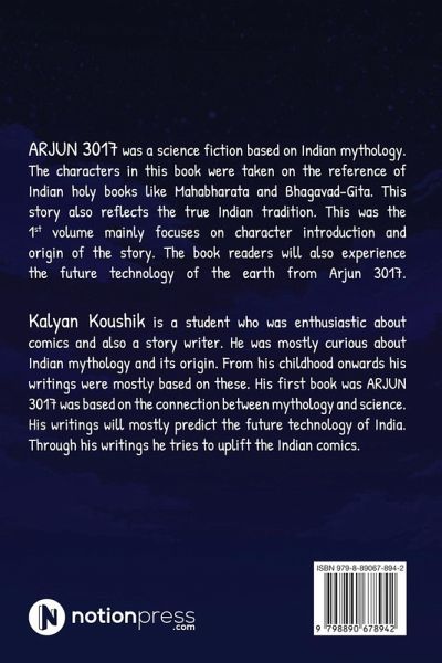 ARJUN 3017 was a science fiction based on Indian mythology. The characters in this book were taken on the reference of Indian holy books like Mahabharata and Bhagavad-Gita. This story also reflects the true Indian tradition. This was the 1st volume mainly focuses on character introduction and origin of the story. The book readers will also experience the future technology of the earth from Arjun 3017.