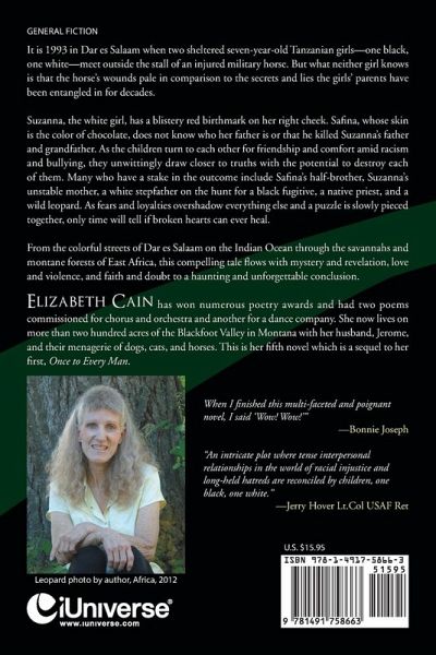 It is 1993 in Dar es Salaam when two sheltered seven-year-old Tanzanian girls-one black, one white-meet outside the stall of an injured military horse. But what neither girl knows is that the horse's wounds pale in comparison to the secrets and lies the girls' parents have been entangled in for decades. Suzanna, the white girl, has a blistery red birthmark on her right cheek. Safina, whose skin is the color of chocolate, does not know who her father is or that he killed Suzanna's father and grandfather. As the children turn to each other for friendship and comfort amid racism and bullying, they unwittingly draw closer to truths with the potential to destroy each of them. Many who have a stake in the outcome include Safina's half-brother, Suzanna's unstable mother, a white stepfather on the hunt for a black fugitive, a native priest, and a wild leopard. As fears and loyalties overshadow everything else and a puzzle is slowly pieced together, only time will tell if broken hearts can ever heal. From the colorful streets of Dar es Salaam on the Indian Ocean through the savannahs and montane forests of East Africa, this compelling tale flows with mystery and revelation, love and violence, and faith and doubt to a haunting and unforgettable conclusion.