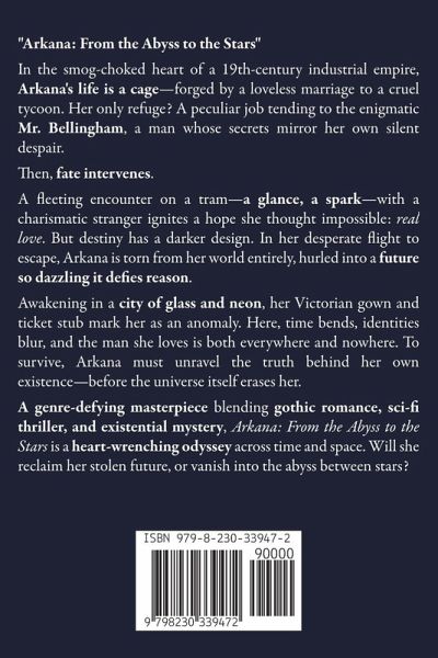 "Arkana: From the Abyss to the Stars" In the smog-choked heart of a 19th-century industrial empire, Arkana's life is a cage-forged by a loveless marriage to a cruel tycoon. Her only refuge? A peculiar job tending to the enigmatic Mr. Bellingham, a man whose secrets mirror her own silent despair. Then, fate intervenes. A fleeting encounter on a tram-a glance, a spark-with a charismatic stranger ignites a hope she thought impossible: real love. But destiny has a darker design. In her desperate flight to escape, Arkana is torn from her world entirely, hurled into a future so dazzling it defies reason. Awakening in a city of glass and neon, her Victorian gown and ticket stub mark her as an anomaly. Here, time bends, identities blur, and the man she loves is both everywhere and nowhere. To survive, Arkana must unravel the truth behind her own existence-before the universe itself erases her. A genre-defying masterpiece blending gothic romance, sci-fi thriller, and existential mystery, Arkana: From the Abyss to the Stars is a heart-wrenching odyssey across time and space. Will she reclaim her stolen future, or vanish into the abyss between stars?