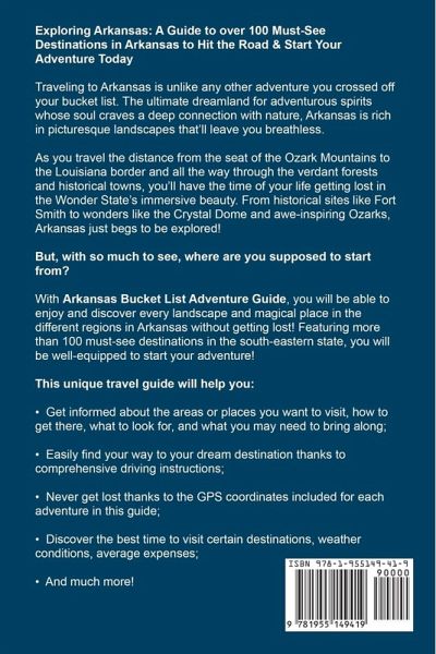 Exploring Arkansas: A Guide to over 100 Must-See Destinations in Arkansas to Hit the Road & Start Your Adventure Today Traveling to Arkansas is unlike any other adventure you crossed off your bucket list. The ultimate dreamland for adventurous spirits whose soul craves a deep connection with nature, Arkansas is rich in picturesque landscapes that'll leave you breathless. As you travel the distance from the seat of the Ozark Mountains to the Louisiana border and all the way through the verdant forests and historical towns, you'll have the time of your life getting lost in the Wonder State's immersive beauty. From historical sites like Fort Smith to wonders like the Crystal Dome and awe-inspiring Ozarks, Arkansas just begs to be explored! But, with so much to see, where are you supposed to start from? With Arkansas Bucket List Adventure Guide, you will be able to enjoy and discover every landscape and magical place in the different regions in Arkansas without getting lost! Featuring more than 100 must-see destinations in the south-eastern state, you will be well-equipped to start your adventure! This unique travel guide will help you:Get informed about the areas or places you want to visit, how to get there, what to look for, and what you may need to bring along; Easily find your way to your dream destination thanks to comprehensive driving instructions; Never get lost thanks to the GPS coordinates included for each adventure in this guide; Discover the best time to visit certain destinations, weather conditions, average expenses; And much more! Grab a copy of this guide, and you're well set to explore Arkansas! Every chapter comes with lesser-known facts about all the amazing 100+ Arkansas destinations featured in this blueprint that'll make you fall in love with this wonderful state even more. Do you dare to break your daily routine and go on an adventure of a lifetime?