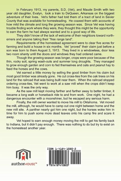 In February 1913, my parents, S.D. (Vet), and Maude Smith with two year old daughter, Evalyn, took a train to DeQueen, Arkansas on the biggest adventure of their lives. Vet's father had told them of a tract of land in Sevier County that was available for homesteading. He coaxed them with accounts of how mild the climate and long the growing season was. Since Vet was having trouble finding work where they were, they thought this might be the opportunity to earn the farm he had always wanted and to a good way of life. They didn't know of the lack of welcome of their neighbors toward northerners and anyone taking their "free range land". Requirements of the homestead agreement were to clear five acres for farming and build a house in six months. Vet "proved" their claim just before a son was born to them August 3, 1913. They lived in a windowless, door less two room shanty until the doors and windows they had ordered came. Though the growing season was longer, crops were poor because of the thin, rocky soil, spring wash-outs and summer long droughts. They managed to grow enough garden and corn to fed themselves and oats and peanut hay to feed the horses and the cows. Vet earned a little money by selling the good timber from his claim but most good timber was already gone. He cut cross-ties from the oak trees on his land for the railroad that was being built near them. When the railroad stopped ordering cross-ties, Vet went to work at a saw mill when the crops didn't keep him busy. It was the only way. As the saw mill kept moving farther and farther away to better timber, it became a long walk or horseback ride to and from work. One night, he had a dangerous encounter with a moonshiner, but he escaped any serious harm. Finally, the mill owner wanted to move his mill to Oklahoma. Vet moved the mill, although, he would have to camp out one night between home and the new mill site.