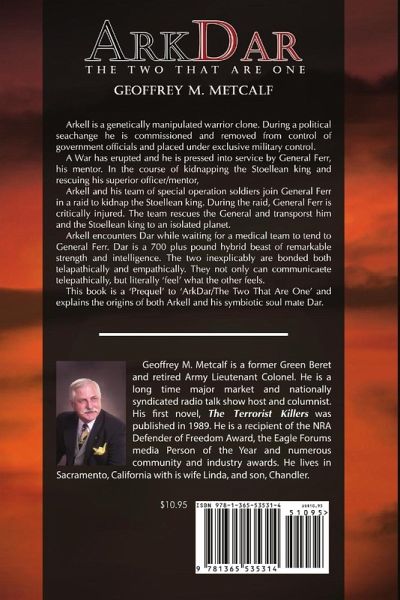 Arkell is a genetically manipulated warrior clone. During a political seachange he is commissioned and removed from control of government officials and placed under exclusive military control. Arkell and his team of special operation soldiers join General Ferr in a raid to kidnap the Stoellean king. During the raid, General Ferr is critically injured. The team rescues the General and transporst him and the Stoellean king to an isolated planet. Arkell encounters Dar while waiting for a medical team to tend to General Ferr. Dar is a 700 plus pound hybrid beast of remarkable strength and intelligence. The two inexplicably are bonded both telapathically and empathically. They not only can communicaete telepathically, but literally 'feel' what the other feels. This book is a 'Prequel' to 'ArkDar/The Two That Are One' and explains the origins of both Arkell and his symbiotic soul mate Dar.