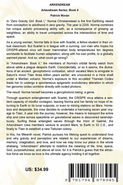 In "Zero Gravity Girl: Book I," Norma Christianstead is the first Earthling raised from conception to adulthood in zero gravity. The year is 2200. Norma combines her unique autistic processing ability with, as a consequence of growing up weightless, an ability to travel unimpeded across the intersections of time and space. As a young woman, Norma falls in love with Scarlet, a fellow student in their virtual classroom. But Scarlet is in league with a cunning con man who hopes his CRISPR-altered virus will lower mammalian body temperatures ten degrees worldwide to facilitate human adaptation, along with his own profits, to a globally warmed planet. And so, what could go wrong? In "Arkendream: Book II," the members of Norma's orbital family watch from above while a plague despoils Earth. Coincidentally, or so it seems, the divinations of an ancient genophotonic civilization, which vacated Mars to emigrate to Saturn's moon Titan three billion years earlier, are uncovered in a mine shaft under a Martian volcano. Norma's exposure to this so-called Tharsian Codex leads her to undergo a spontaneous epigenetic evolutionary alteration in which her genomic codes combine directly with coded photons. The result: Norma herself becomes a genophotonic being: a genie. Through quantum entanglement with Scarlet, the CRISPR virus attains a sentient capacity of mindful contagion, leaving Norma and her family no hope of returning to Earth or its lunar outposts, or even to mining stations on Mars. Homeless and desperate, the crew decides to undertake a harrowing seven year voyage to Titan. A year into the journey, however, the means to transport the entire ship and crew across spacetime on gravitational waves is discovered serendipitously. Surfing these entangled waves through the Horn of Gabriel, the Arkendream crew members venture to ancient Mars, to Earth in 33 C.E., and finally to Titan to establish a new Tellurian colony. In this, his fifteenth novel, Patrick pursues his lifelong quest to understand how and why gravity and perception are related to our experiences of dreams, memory, imagination, and love, and how we may know our place in the whole shebang. "Arkendream" attempts to redefine the meaning of life, time, space, God, purposefulness, and above all love, for it is Patrick's guess that the attractive force we know as love is the ultimate agency holding it all together.