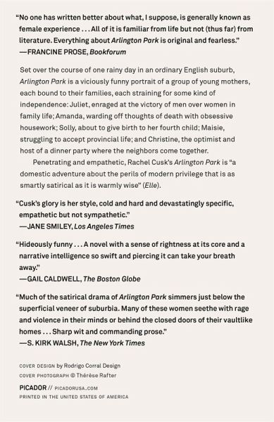 A Sunday Times (London) Top 100 Novel of the Twenty-First Century "No one has written better about what, I suppose, is generally known as female experience . . . All of it is familiar from life but not (thus far) from literature. Everything about Arlington Park is original and fearless." -Francine Prose, Bookforum Set over the course of one rainy day in an ordinary English suburb, Arlington Park is a viciously funny portrait of a group of young mothers, each bound to their families, each straining for some kind of independence: Juliet, enraged at the victory of men over women in family life; Amanda, warding off thoughts of death with obsessive housework; Solly, about to give birth to her fourth child; Maisie, struggling to accept provincial life; and Christine, the optimist and host of a dinner party where the neighbors come together. Penetrating and empathetic, Rachel Cusk's Arlington Park is "a domestic adventure about the perils of modern privilege that is as smartly satirical as it is warmly wise" (Elle).