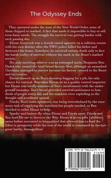 They operated under the nose of the New World Order, none of them chipped or marked. A fact that made it impossible to buy or sell even basic needs. The struggle for survival was getting harder with each passing day. Elezar Aronivich was a Jewish raised agnostic on a collision course with his own destiny after the NWO police killed his father and destroyed his home. Somehow, he survived certain death only to face the harsh reality of survival without the mark in the Beast's marked society. His only surviving relative was an estranged uncle, Benjamin Ben-Hadid who owned the local bread factory. Ben, although an unmarked Christian, managed to survive because his factory catered to the Beast and his cronies. Elezar showed up on Ben's doorstep begging for a job, his only chance for survival. Ben takes Elezar on as a quality control inspector but Elezar was totally unaware of Ben's involvement with the underground economy. Ben's bread provided survival sustenance to hundreds of people every day and the numbers were exploding as the drought and pestilence spread. Frieda, Ben's main operative, was being overwhelmed by the enormous task of supplying the nutrition her people needed, so Ben decided to enlist Elezar to help. Sparks-and knives-fly when Elezar and Frieda meet. Frieda and Ben lead Elezar to discover the Way. Elezar is given gifts (abilities) never before entrusted to humankind that allowed him to lead the Eden to prosperity while the rest of the world is consumed by the last great battle; Armageddon!