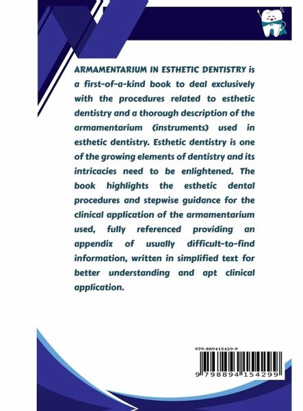 ARMAMENTARIUM IN ESTHETIC DENTISTRY is a first-of-a-kind book to deal exclusively with the procedures related to esthetic dentistry and a thorough description of the armamentarium (instruments) used in esthetic dentistry. Esthetic dentistry is one of the growing elements of dentistry and its intricacies need to be enlightened. The book highlights the esthetic dental procedures and stepwise guidance for the clinical application of the armamentarium used, fully referenced providing an appendix of usually difficult-to-find information, written in simplified text for better understanding and apt clinical application.