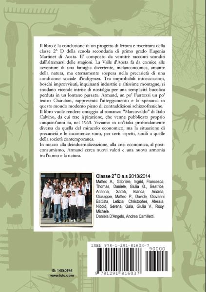 EDIZIONE CARTACEA. Il libro è la conclusione di un progetto di lettura e riscrittura della classe 2°D dell'Istituzione Scolastica Eugenia Martinet di Aosta, condotto dal prof. Andrea Camilletti. È composto da ventitré racconti scanditi dall'alternarsi delle stagione. La Valle d'Aosta fa da cornice alle avventure del protagonista Armand, uomo impacciato, divertente, melanconico, amante della natura e della sua allegra famiglia eternamente sospesa nella precarietà di una condizione sociale d'indigenza. Tra improbabili intossicazioni, boschi improvvisati, inquinanti industrie e altissime montagne, si snodano vicende intrise di nostalgia per una semplicità bucolica perduta in un lontano passato. Armand, un po' Fantozzi e un po' teatro Charaban, rappresenta l'atteggiamento e la speranza in questo mondo moderno pieno di contraddizioni schizofreniche. Un omaggio a Calvino e al libro "Marcovaldo" che venne pubblicato proprio cinquant'anni fa, nel 1963.