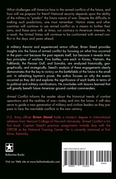 What challenges will America face in armed conflicts of the future and how will we prepare for them? National security depends upon the ability of the military to "predict” the future nature of war. Despite the difficulty in making such predictions, one must remember: nation states and other countries will continue to use armed conflict as a means to further their aims, and these aims will, at times, run contrary to American interests. As a result, the United States will continue to be confronted with armed conflict in the days and years ahead. A military theorist and experienced armor officer, Brian Steed provides insights into the future of armed conflict by focusing on what has occurred in the past-not because the past repeats itself, but because it reveals timeless principles of warfare. Five battles, one each in Korea, Vietnam, the Falklands, the Persian Gulf, and Somalia are analyzed historically, geographically, and strategically. Steed's analysis of these engagements clearly demonstrates that the key to victory on the battlefields of the future is the small unit. In refreshing layman's prose, the author focuses on why the events occurred as they did, and explores the significance of each battle in terms of its political and military ramifications. He concludes with lessons learned that will greatly benefit future American ground combat commanders. Armed Conflict informs the reader about the historical trends of combat operations and the realities of war-today and into the future. It will also serve to guide a new generation of military and civilian leaders as they prepare to face the inevitable conflicts in the new century.