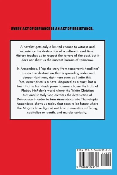 A novelist gets only a limited chance to witness and experience the destruction of a culture in real time. History teaches us to respect the terrors of the past, but it does not show us the nascent horrors of tomorrow. In Armendrica, I "rip the story from tomorrow's headlines" to show the destruction that is spreading wider and deeper right now, right here even as I write this. Yes, Armendrica is a novel disguised as a tract, but a tract that in fast-track prose hammers home the truth of Flabby McFelon's world where the White Christian Nationalist Holy God dictates the destruction of Democracy in order to turn Armendrica into Thanatopia. Armendrica shows us today that soon-to-be future where the Magats have figured out how to monetize suffering, capitalize on death, and murder curiosity.