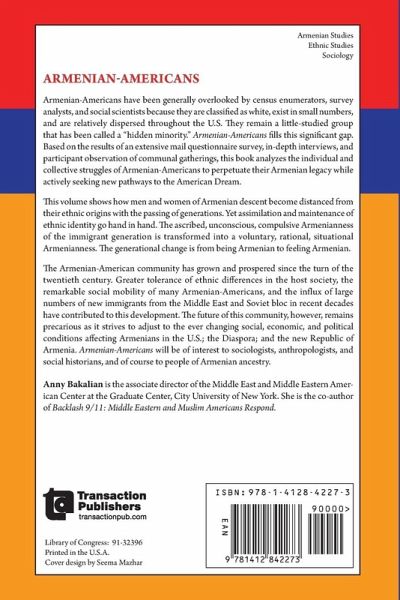 Assimilation has been a contentious issues for most immigrant groups in the United States. The host society is assumed to lire immigrants and their descendants away from their ancestral heritage. Yet, in their quest for a "better" life, few immigrants intentionally forsake heir ethnic identity; most try to hold onto their culture by transplanting their traditional institutions and recreating new communities in America. Armenian-Americans are no exception. Armenian-Americans have been generally overlooked by census enumerators, survey analysts, and social scientists because of their small numbers and relative dispersion throughout the United States. They remain a little-studied group that has been called a "hidden minority." Armenian Americans fills this significant gap. Based on the results of an extensive mail questionnaire survey, in-depth interviews, and participant observation of communal gatherings, this book analyzed the individual and collective struggles of Armenian-Americans to perpetuate their Armenian legacy while actively seeking new pathways to the American Dream. This volume shows how men and women of Armenian descent become distanced from their ethnic origins with the passing of generations. Yet assimilation and maintenance of ethnic identity go hand-in-hand. The ascribed, unconscious, compulsive Armenianness of the immigrant generation is transformed into a voluntary, rational, situational Armenianness. The generational change is from being Armenian to feeling Armenian. The Armenian-American community has grown and prospered in this century. Greater tolerance of ethnic differences in the host society, the remarkable social mobility of many Armenian-Americans and the influx of large numbers of new immigrants from the Middle East and Soviet bloc in recent decades have contributed to this development. The future of this community, however, remains precarious as it strives to adjust to the ever changing social, economic, and political conditions affecting Armenians in the United States; the diaspora; and the new republic of Armenia. Armenian-Americans will be of interest to sociologists, anthropologists, and social historians, and of course to people of Armenian ancestry.