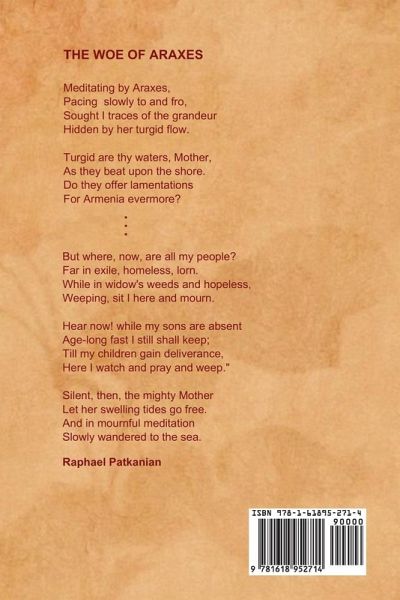 THE WOE OF ARAXES Meditating by Araxes, Pacing slowly to and fro, Sought I traces of the grandeur Hidden by her turgid flow. Turgid are thy waters, Mother, As they beat upon the shore. Do they offer lamentations For Armenia evermore? . . . But where, now, are all my people? Far in exile, homeless, lorn. While in widow's weeds and hopeless, Weeping, sit I here and mourn. Hear now! while my sons are absent Age-long fast I still shall keep; Till my children gain deliverance, Here I watch and pray and weep." Silent, then, the mighty Mother Let her swelling tides go free. And in mournful meditation Slowly wandered to the sea. Raphael Patkanian