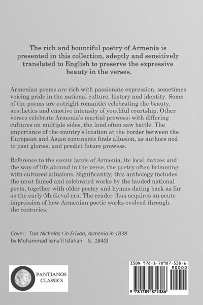 The rich and bountiful poetry of Armenia is presented in this collection, adeptly and sensitively translated to English to preserve the expressive beauty in the verses. Armenian poems are rich with passionate expression, sometimes voicing pride in the national culture, history and identity. Some of the poems are outright romantic; celebrating the beauty, aesthetics and emotive intensity of youthful courtship. Other verses celebrate Armenia's martial prowess; with differing cultures on multiple sides, the land often saw battle. The importance of the country's location at the border between the European and Asian continents finds allusion, as authors nod to past glories, and predict future prowess. Reference to the scenic lands of Armenia, its local dances and the way of life abound in the verse, the poetry often brimming with cultured allusions. Significantly, this anthology includes the most famed and celebrated works by the lauded national poets, together with older poetry and hymns dating back as far as the early-Medieval era. The reader thus acquires an acute impression of how Armenian poetic works evolved through the centuries.