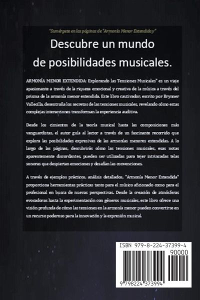 "Armonía Menor Extendida: Explorando las Tensiones Musicales" es un viaje apasionante a través de la riqueza emocional y creativa de la música a través del prisma de la armonía menor extendida. Este libro cautivador, escrito por Brynner Vallecilla, desentraña los secretos de las tensiones musicales, revelando cómo estas complejas interacciones transforman la experiencia auditiva. Desde los cimientos de la teoría musical hasta las composiciones más vanguardistas, el autor guía al lector a través de un fascinante recorrido que explora las posibilidades expresivas de las armonías menores extendidas. A lo largo de las páginas, descubrirás cómo las tensiones musicales, esas notas aparentemente discordantes, pueden ser utilizadas para tejer intrincadas telas sonoras que despiertan emociones y desafían las convenciones. A través de ejemplos prácticos, análisis detallados, "Armonía Menor Extendida" proporciona herramientas prácticas tanto para el músico aficionado como para el profesional en busca de nuevas perspectivas. Desde la creación de atmósferas evocadoras hasta la experimentación con géneros musicales, este libro ofrece una visión profunda de cómo las tensiones en la armonía menor pueden convertirse en un recurso poderoso para la innovación y la expresión musical. Sumérgete en las páginas de "Armonía Menor Extendida" y descubre un mundo de posibilidades musicales que desafía los límites convencionales, inspirando a músicos a explorar nuevas dimensiones en su búsqueda de la expresión artística y la conexión emocional a través de la música.