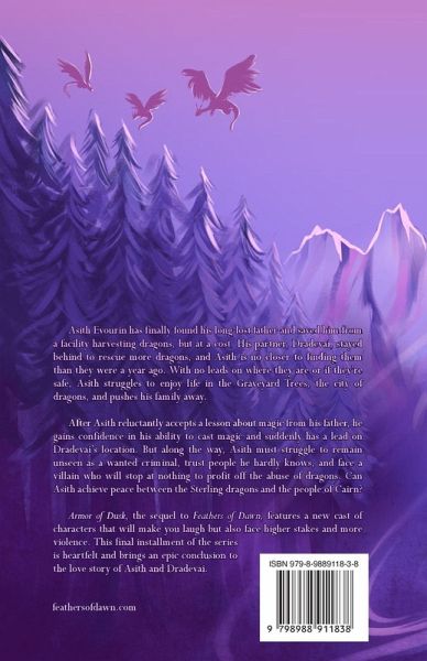 The final installment following Feathers of Dawn has higher stakes, features more fluff and more violence, and concludes the epic love story of Asith and Dradevai. Armor of Dusk is perfect for Dungeons & Dragons lovers! Asith Evourin has finally found his long-lost father and saved him from a facility harvesting dragons, but at a cost. His partner, Dradevai, stayed behind to rescue more dragons, and Asith is no closer to finding them than they were a year ago. With no leads on where they are or if they're safe, Asith struggles to enjoy life in the Graveyard Trees, the city of dragons, and pushes his family away. Everything changes after Asith reluctantly accepts a lesson about magic from his father. He gains confidence in his ability to cast magic and suddenly retrieves a lead on Dradevai's location. But along the way, Asith must struggle to remain unseen as a wanted criminal, trust people he hardly knows, and face a villain who will stop at nothing to profit off the abuse of dragons. Can Asith achieve peace between the Sterling dragons and the people of Cairn?Cuddle up with this cozy fantasy about dragons A stunning sequel to a slow burn fantasy for adults An incredible queer romance fantasy series Impressive book about magical dragons for adults