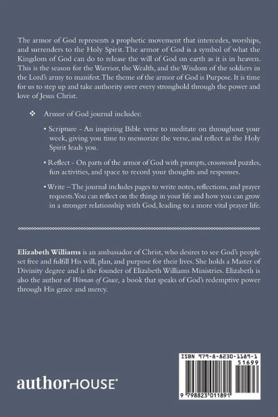 The armor of God represents a prophetic movement that intercedes, worships, and surrenders to the Holy Spirit. The armor of God is a symbol of what the Kingdom of God can do to release the will of God on earth as it is in heaven. This is the season for the Warrior, the Wealth, and the Wisdom of the soldiers in the Lord's army to manifest. The theme of the armor of God is Purpose. It is time for us to step up and take authority over every stronghold through the power and love of Jesus Christ. Armor of God journal includes: ¿ Scripture - An inspiring Bible verse to meditate on throughout your week, giving you time to memorize the verse, and reflect as the Holy Spirit leads you. ¿ Reflect - On parts of the armor of God with prompts, crossword puzzles, fun activities, and space to record your thoughts and responses. ¿ Write - The journal includes pages to write notes, reflections, and prayer requests. You can reflect on the things in your life and how you can grow in a stronger relationship with God, leading to a more vital prayer life.
