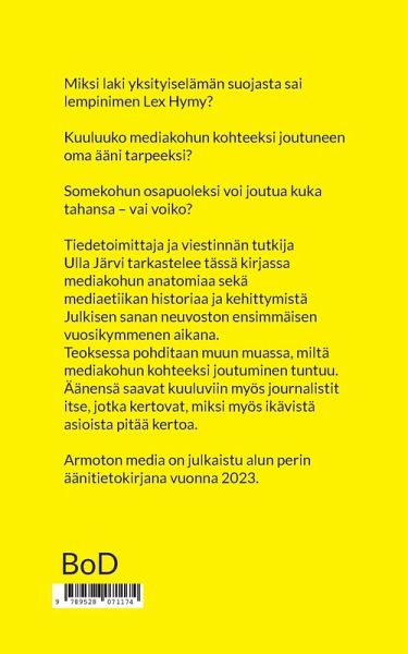 Armoton media -tietokirjassaan tiedetoimittaja ja viestinnäntutkija Ulla Järvi tarkastelee mediakohun anatomiaa ja mediaetiikan historiaa ja kehittymistä. Hän on seurannut mediakohuja jo vuosien ajan ja tarkastellut niitä etenkin eri osapuolten näkökulmasta sekä arkistoja tutkien että ihmisiä haastatellen. Tässä teoksessa pohditaan muun muassa, miltä mediakohun kohteeksi joutuminen tuntuu. Lukija vakuuttuu nopeasti siitä, ettei varsinkaan todella kielteisestä julkisuudesta aiheutuvia seurauksia yksittäisille ihmisille aina ajatella riittävästi. Armoton media on julkaistu alunperin äänitietokirjana, ja se on kuunneltavissa suoratoistopalveluissa.