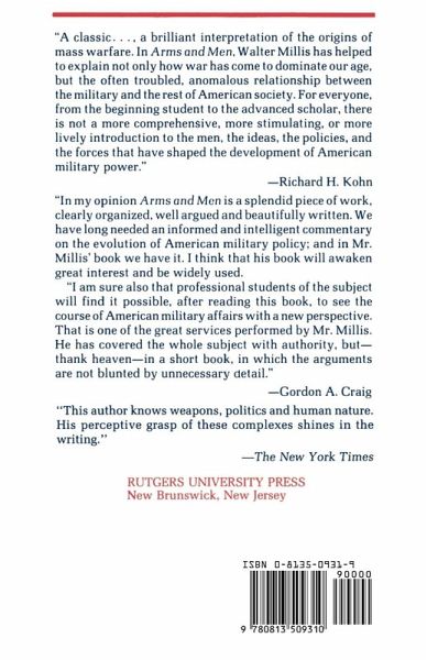 "A classic..., a brilliant interpretation of the origins of mass warfare. In Arms and Men, Walter Millis has helped to explain not only how war has come to dominate our age, but the often troubled, anomalous relationship between the military and the rest of American society. For everyone, from the beginning student to the advanced scholar, there is not a more comprehensive, more stimulating, or more lively introduction to the men, the ideas, the policies, and the forces that have shaped the development of American military power." --Richard H. Kohn "In my opinion Arms and Men is a splendid piece of work, clearly organized, well argued and beautifully written. We have long needed an informed and intelligent commentary on the evolution of American military policy; and in Mr. Millis' book we have it. I think that his book will awaken great interest and be widely used. I am sure also that professional students of the subject will find it possible, after reading this book, to see the course of American military affairs with a new perspective. That is one of the great services performed by Mr. Millis. He has covered the whole subject with authority, but - thank heaven - in a short book, in which the arguments are not blunted by unnecessary detail." --Gordon A. Craig "This author knows weapons, politics and human nature. His perceptive grasp of these complexes shines in the writing." --The New York Times