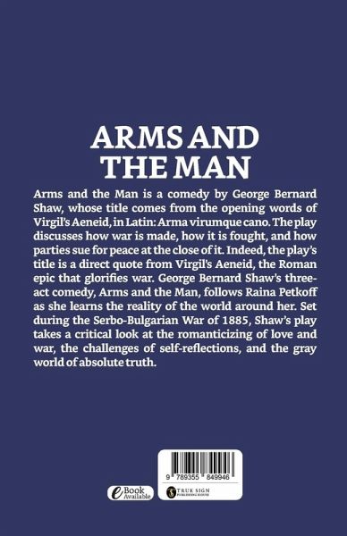 Arms and the Man is a comedy by George Bernard Shaw, whose title comes from the opening words of Virgil's Aeneid, in Latin: Arma virumque cano. The play discusses how war is made, how it is fought, and how parties sue for peace at the close of it. Indeed, the play's title is a direct quote from Virgil's Aeneid, the Roman epic that glorifies war. George Bernard Shaw's three-act comedy, Arms and the Man, follows Raina Petkoff as she learns the reality of the world around her. Set during the Serbo-Bulgarian War of 1885, Shaw's play takes a critical look at the romanticizing of love and war, the…mehr