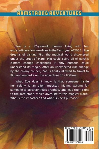 Zoe is a 12-year-old human living with her extraordinary family on Mars in the Earth year of 2065. Zoe dreams of visiting Pilu, the magical world discovered under the crust of Mars. Pilu could solve all of Earth's climate change challenges if only humans could understand its magic. After an unexpected rule change by the colony council, Zoe is finally allowed to travel to Pilu and embarks on the adventure of a lifetime. What Zoe doesn't know is that someone inside her colony is an alien imposter, hiding, waiting for someone to discover Pilu's prophecy and lead them right to the Torq stone, which gives life to this magical world. Who is the imposter? And what is Zoe's purpose?