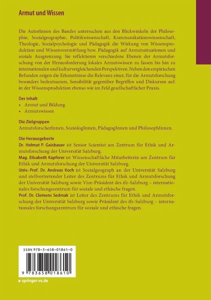 'Die AutorInnen des Bandes untersuchen aus den Blickwinkeln der Philosophie, Sozialgeographie, Politikwissenschaft, Kommunikationswissenschaft, Theologie, Sozialpsychologie und Pädagogik die Wirkung von Wissensproduktion und Wissensvermittlung bzw. Pädagogik auf Armutssituationen und soziale Ausgrenzung. Sie reflektieren verschiedene Ebenen der Armutsforschung von der Herausforderung lokales Armutswissen zu fassen bis hin zu internationalen und kulturvergleichenden Perspektiven. Neben den empirischen Befunden zeigen die Erkenntnisse die Relevanz einer, für die Armutsforschung besonders bedeutsamen, Sensibilität gegenüber Begriffen und Diskursen auf: in der Wissensproduktion ebenso wie im Feld gesellschaftlicher Praxis.