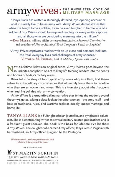 Army Wives goes beyond the sound bites and photo ops of military life to bring readers into the hearts and homes of today's military wives. Biank tells the story of four typical Army wives who, in a flash, find themselves in extraordinary circumstances that ultimately force them to redefine who they are as women and wives. This is a true story about what happened when real life collided with army convention. Army Wives is a groundbreaking narrative that takes the reader beyond the Army's gates, taking a close look at the other woman-the Army itself-and how its traditions, rules and war-time realities deeply impact marriage and home life.