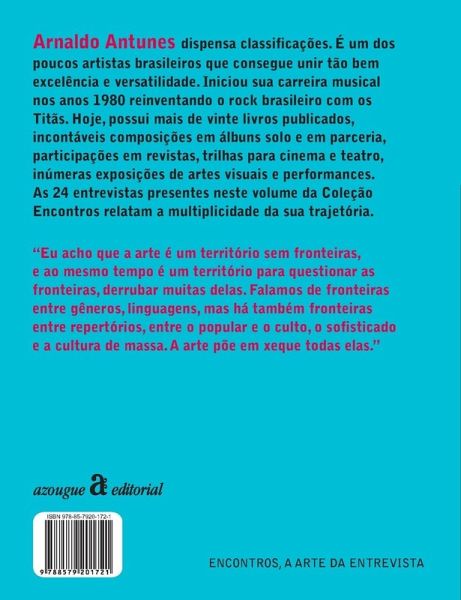Encontros (Meetings) is the largest and most prestigious book collection of interviews with Brazilian artists and thinkers. With more than 50 published titles, Encontros provides a broad panorama of Brazil's cultural and intellectual wealth. Arnaldo Antunes needs no classification. He is one of the few Brazilian artists who manages to unite excellence and versatility so well. He started his musical career in the 1980's reinventing Brazilian rock with the band Titãs. Today, he has published more than twenty books, countless compositions in solo and collaborative albums, participations as publisher of poetry magazines, creation of soundtracks for cinema and theater, and countless visual arts exhibitions and performances. The 24 interviews present in this volume of the Encontros Collection relate the multiplicity of his trajectory.
