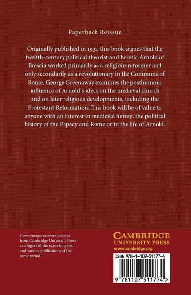 Originally published in 1931, this book argues that the twelfth-century political theorist and heretic Arnold of Brescia worked primarily as a religious reformer and only secondarily as a revolutionary in the Commune of Rome. George Greenaway examines the posthumous influence of Arnold's ideas on the medieval church and on later religious developments, including the Protestant Reformation. This book will be of value to anyone with an interest in medieval heresy, the political history of the papacy and Rome or in the life of Arnold.