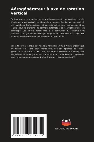 Ce livre présente la recherche et le développement d'un système complet d'éolienne à axe vertical. Le climat de la région sélectionnée est analysé. Les questions technologiques et opérationnelles sont examinées, et un logiciel pour le système de contrôle automatisé de l'aérogénérateur est développé. Les calculs nécessaires à la conception du système sont effectués. Le système de freinage adaptatif de l'éolienne est conçu. Les schémas de l'installation expérimentale sont présentés.
