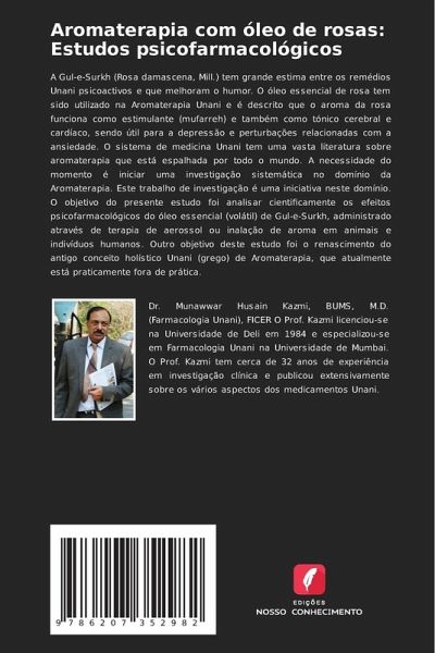 A Gul-e-Surkh (Rosa damascena, Mill.) tem grande estima entre os remédios Unani psicoactivos e que melhoram o humor. O óleo essencial de rosa tem sido utilizado na Aromaterapia Unani e é descrito que o aroma da rosa funciona como estimulante (mufarreh) e também como tónico cerebral e cardíaco, sendo útil para a depressão e perturbações relacionadas com a ansiedade. O sistema de medicina Unani tem uma vasta literatura sobre aromaterapia que está espalhada por todo o mundo. A necessidade do momento é iniciar uma investigação sistemática no domínio da Aromaterapia. Este trabalho de investigação é uma iniciativa neste domínio. O objetivo do presente estudo foi analisar cientificamente os efeitos psicofarmacológicos do óleo essencial (volátil) de Gul-e-Surkh, administrado através de terapia de aerossol ou inalação de aroma em animais e indivíduos humanos. Outro objetivo deste estudo foi o renascimento do antigo conceito holístico Unani (grego) de Aromaterapia, que atualmente está praticamente fora de prática.